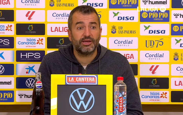 "Lo primero, estamos también muy dolidos porque queríamos dar esta victoria a Kirian, que no hemos podido conseguir, ni siquiera ese punto que creo que el equipo ha merecido. Así es el fútbol, hemos generado muchas ocasiones, pero hemos tenido poca eficacia en el área rival, y a mí particularmente la primera parte me ha gustado, hemos hecho un buen trabajo, aunque nos enfrentamos a un rival muy fuerte. Creo que controlamos muy bien el partido salvo por dos pérdidas nuestras, y creo que la primera parte fue nuestra. Luego es cierto que empezamos bien la segunda parte, pero después del gol tuvimos un tramo en el que no estuvimos bien, y evidentemente en Primera División, esos errores que ya sabíamos que podían suceder, no hemos estado acertados. Al final del partido el equipo ha intentado de todas las maneras posibles, hemos tenido ocasiones de todo tipo: un larguero, mano a mano con el portero, balones dentro del área, y, bueno, desgraciadamente esa eficacia últimamente nos está dando la espalda. Hay que seguir, seguir luchando, seguir trabajando, y sobre todo me quedo con la creencia, hasta el último minuto, hasta el último segundo, y con la unión con la gente, porque eso es lo que nos va a ayudar antes de finalizar la temporada".