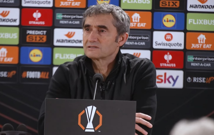 El entrenador del Athletic Club, Ernesto Valverde, ha atendido a los medios de comunicación este jueves por la noche, durante la rueda de prensa posterior al partido contra la AS Roma, correspondiente a la ida de los octavos de final de la UEFA Europa League, que se disputó en el Estadio Olímpico de Roma.