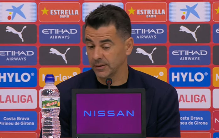 "Yo no le llamo mala suerte. Actitud no falta. Quizás un poco de determinación, de agresividad. Danjuma ha tenido 3 o 4 situaciones con ventaja para poner el centro. No lo hace. Tienes que tener más determinación. Pero hay otros jugadores que ni siquiera dan ese uno contra uno y hemos estado muy especulativos en el pase. A nivel de conjunto, para superar una presión o para superar un bloque medio o un bloque bajo, tiene que haber un punto de individualidad. Y es lo que les he dicho: mirad a la cara al rival. Si trabajamos sobre esto... Y no son mejores rivales que los que tenéis en el día a día. Tú, ni Danjuma, ni Víktor, ni Krejci se encuentran. Claro, si te enfrentas al Barça todos los domingos, sí que tienes rivales más difíciles de los que tienes en el día a día. Pero el 80% de los equipos en Primera División... nosotros tenemos una buena plantilla. El reto de ese duelo es el que te doy yo y es el que te exijo yo en el entrenamiento. Si tú en el entrenamiento estás dando el 200%, tanto en ataque como en defensa, en la competición ese 200%, o ese 100%, te va a servir. En algunas situaciones el rival te ganará y en otras ganarás tú. Pero sigue intentándolo. Es lo único que les pido. Porque hay muchos equipos que están en nuestra misma situación. Y ganarle un duelo hoy al Alavés es igual de difícil que el Alavés nos lo gane a nosotros. Y ya está. Es la realidad. Eso hay que asumirlo. Que te van a ganar duelos, pero que tú vas a ganar duelos. Es así. Y es un tema de mentalidad. Las áreas... No suerte. No, no es suerte. Es determinación y es compromiso mental de que, si tengo una, tengo que aprovecharla. No tenemos ese bagaje ofensivo de otras temporadas. Por eso hoy les pedí portería a cero. Se ha hablado mucho de portería a cero. Y ya hemos controlado muy bien las transiciones del rival, el juego directo, menos en una situación. Y luego al final en alguna otra. Y el balón parado era importante. Pero no es suerte que nos metan el gol que nos han metido. Como les dije la semana pasada, el gol que nos mete el Barça, el 2-1, cuando tú empatas y ellos pueden entrar en una situación —aunque nos pueden ganar luego—, pero pueden entrar en una situación un poco más de tensión, nos meten un 2-1 donde no podemos defender como defendimos. Hoy no podemos defender un balón del portero como hemos defendido. Eso no es suerte. Eso no es suerte. Hay duelos. Tienes que saber que no puede pasar nada. Nos estamos jugando mucho. Creo que es importantísimo que todo el mundo sepa lo que nos estamos jugando. Ya les he dicho a los jugadores que levanten la cabeza, pero que sepan lo que se están jugando. Yo tengo, con lo bueno o lo malo que soy, un compromiso al 200% con este club. Creo muchísimo en este proyecto y quiero pelear en este proyecto por estar mucho tiempo. Y les he dicho: digo, vosotros tenéis que pensar igual, que estáis en un proyecto precioso. Podrán llamar de muchos sitios, siempre en el fútbol pasan estas cosas con los jugadores. Pero vamos a solucionar lo que tenemos entre manos antes de pensar en otras cosas. El proyecto es este, y yo quiero estar en este proyecto. Y quiero que ellos estén en estas ocho jornadas en este proyecto, a morir por salvar al Girona y que estemos en Primera División el año que viene".