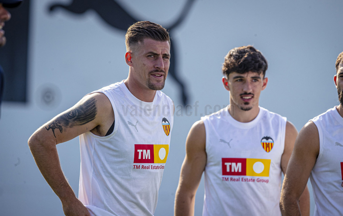 El técnico del conjunto che, Carlos Corberán, ha dirigido una sesión en la que el nuevo fichaje del club valencianista, Baptiste Santamaría, se ha ejercitado por primera vez a sus órdenes, integrándose con el grupo y participando en los ejercicios programados. Por su parte, Thierry y Alberto Marí permanecen en la enfermería, siguiendo sus respectivos procesos de recuperación. El trabajo ha combinado aspectos físicos y tácticos, con especial énfasis en la circulación rápida de balón y la presión tras pérdida.
