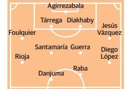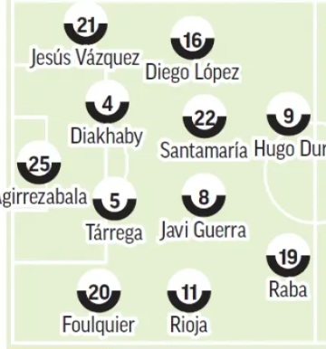 Agirrezabala; Foulquier, Tàrrega, Diakhaby, Jesús Vázquez; Santamaria, Javi Guerra, Rioja, Diego López; Danjuma o Duro, Raba