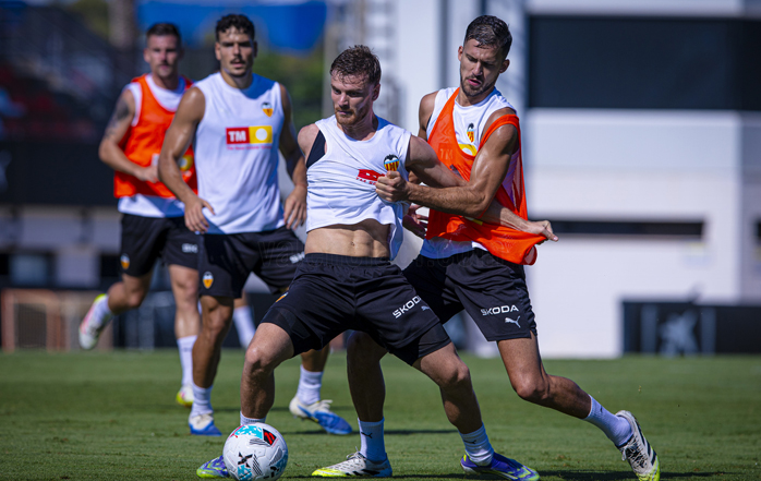 El técnico del conjunto che, Carlos Corberán, ha dirigido una sesión en la que ha tenido a toda la plantilla disponible, sin lesionados ni jugadores tocados. El entrenador valencianista sigue meditando el sistema defensivo que utilizará en el choque, con la posibilidad de alinear una defensa de tres centrales, donde entraría Copete o incluso Foulquier como tercer zaguero. En ese esquema, Rioja podría desempeñar el papel de carrilero, aunque la opción de Copete gana enteros por su perfil zurdo.