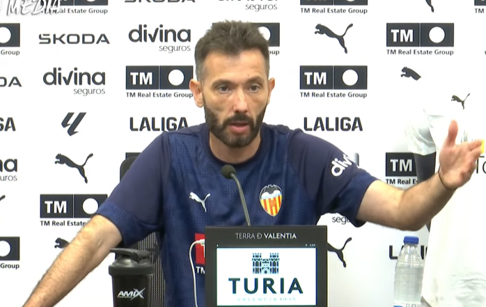 "Lo primero es que está la federación y está la Liga, que son quienes fijan unas normas y son ellos quienes tienen que velar porque las normas que ellos fijan se cumplan. No somos nosotros, no me corresponde a mí tener que hacer velar porque las normas que otro organismo pone, ese mismo organismo haga que se cumplan. Es una situación atípica que no es normal. Lo que yo he hecho es centrarme en lo que depende de nosotros, que es nosotros mismos, en el rival y en preparar ese partido independientemente del campo en el que se juegue. Es verdad que es una situación que no es normal y sobre todo porque afecta, para mí, a la parte más importante del fútbol, que es el aficionado. El aficionado que no sabe las entradas o que se tiene que desplazar, que quiere ver al equipo. Y es verdad que cuando se supo el estadio, el club hizo un esfuerzo en movilizarse para asegurar que los valencianistas, parte de la afición, pueda estar en el estadio, que pueda estar acompañando al equipo y han logrado que 290 personas estén junto a nosotros acompañando y animando al equipo. Y eso es positivo porque que la afición valencianista pueda estar es algo para nosotros necesario. Así que valorar las normas que yo no fijo, quien las fija tiene que velar por ellas y esta ha sido, entendemos, una situación atípica que no ha sido normal y no ha sido, quizás, acorde al nivel de prestigio que tiene que tener esta competición."