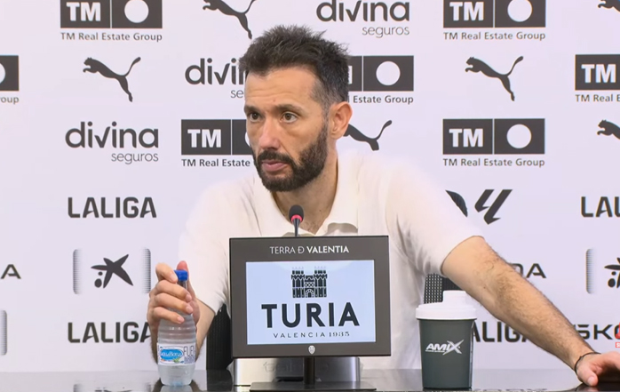 "Buenas a todos. Te valoraría el partido. Hasta el minuto 35 de la primera parte ha sido un partido. A partir del minuto 35 de la primera parte ha sido otro partido. Y para mí no diferenciaría al Valencia de antes de la expulsión de ellos, al Valencia de después de la expulsión. Porque para mí la mejoría del equipo, en el momento hemos sido capaces de ajustarnos en nuestra banda izquierda a nivel defensivo, pasando a Rioja al lado izquierdo para ajustarnos en defensa. En el momento el equipo ha entendido el por qué hacíamos eso. La mejoría del equipo ha sido clara en defensa. Una vez hemos ido al descanso hemos podido, con ese ajuste defensivo, entender lo que teníamos que hacer en ataque. Y luego pienso que el equipo hasta la expulsión ya era mejor y había mostrado otra cara muy diferente a la primera mitad. Y a partir de la expulsión esa superioridad se ha visto muy incrementada. Entonces yo te dividiría el partido en primera mitad y en segunda mitad. Porque para mí es donde el Valencia ha mostrado dos caras distintas."