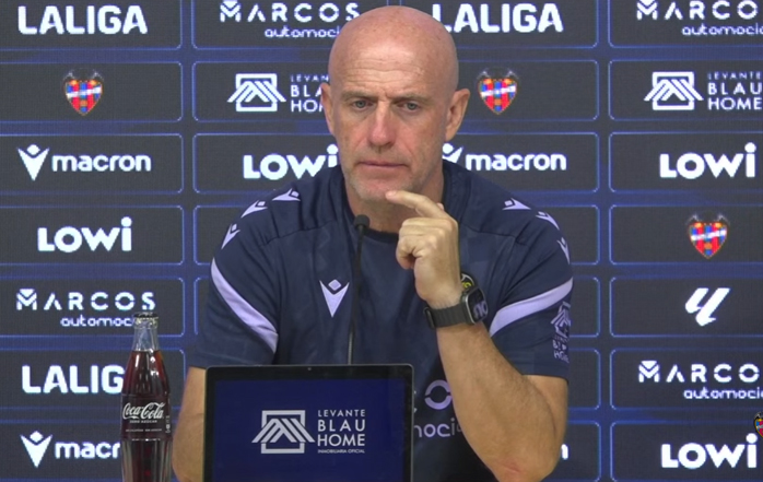 "Pero ¿sabes qué pasa? Que tampoco voy a parar que la gente esté bien. Tengo que estar siempre... Parece que tenemos que estar en el fútbol siempre un poco con... a ver si voy a decir esto y luego nos van a ganar. Bueno pues claro, porque en el fútbol se gana o se pierde, pero cuando ganas partidos y cuando estás bien pues hay que dejar que la gente también fluya a la energía positiva. Yo creo mucho en las energías y si fluye energía positiva es más fácil que pasen cosas buenas. Evidentemente solamente hemos ganado un partido, ha sido romper el cascarón, nada más. Somos conscientes de ello. También somos conscientes de quién viene. Viene el Miura y torear a un Miura con los cuernos tan alargados va a ser muy difícil, pero vamos a intentar hacer todo lo posible y mucho mejor desde un estado de ánimo positivo y desde ver a la gente ilusionada que verla desde una posición de estar encogido, temeroso y con miedo a lo que pueda pasar. A ver si me va a coger el toro y me va a dar un revolcón importante. Entonces no, no se puede salir así a la plaza. Hay que salir con actitud positiva y por eso bueno, hago que fluye esa energía positiva aprovechando también la victoria del otro día que era la primera después de 1.300 días. La victoria que me han comentado que ha sido la más amplia de la historia del Levante fuera de casa. Bueno, pues son cosas que hay que hacer que le lleguen al vestuario porque repito, es energía positiva. Así que no se la voy a quitar yo la energía positiva, pero sí con los pies en el suelo, sin duda."