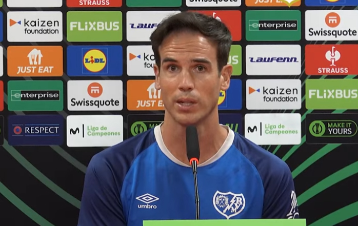 "Bueno, estoy muy contento, feliz, pleno, porque soy consciente de lo afortunado que soy. Primero, de poder entrenar al Rayo Vallecano en un primer momento, de poder venir aquí con un grupo que ya conocía y que te facilita muchísimo el trabajo. Segundo, también muy afortunado de poder vivir el centenario de un club. También me pasó en Osasuna y soy consciente de que eso es una suerte grande para alguien que comienza, todavía más. Y si encima ese mismo año somos capaces de conseguir participar en competiciones europeas después de tanto tiempo, la verdad que estoy pleno de felicidad de que llegue mañana y de que la gente que más ha perseguido objetivos, a pesar de la dificultad, los haya conseguido. Estoy contento, la verdad, estoy muy ilusionado con esta competición porque creo que es un premio merecido para todos los rayistas, incluidos los jugadores. Y la forma de afrontarla, es siendo muy agresivos, por eso hablamos de poder ganarla, porque tenemos esta opción. ¿Cómo vamos a ser temerosos? ¿Cómo vamos a decir que no vamos partido a partido? La forma de afrontarla es quitarnos toda la presión del mundo y decir que vamos a ir a ganarla. Sabemos de las dificultades, pero creo que es la forma que debemos afrontarla y retroalimentar este mensaje. Luego, si nos echan a la primera de cambio, pues no pasará absolutamente nada porque es fútbol, pero la idea y la mentalidad y la ilusión deben basarse en esta idea matriz."