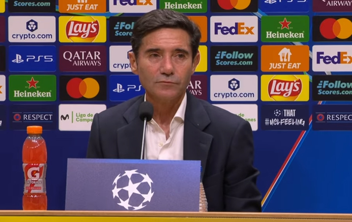 "Bueno, con nuestras posibilidades hemos intentado hacer un equipo súper competitivo. La temporada pasada para quedar quinto clasificado, empatado con el cuarto y a seis puntos del tercero, y este año para demostrar que vamos terceros en la tabla después de siete jornadas y que en Champions competimos con rivales de muchísima entidad. El físico hoy en día es muy importante. Este equipo es muy fuerte, muy poderoso. Un equipo que a nivel físico tiene medias de más de 120 kilómetros por partido. Hemos sido capaces de pelear con ellos. Yo creo que ellos han tenido acciones puntuales a nivel individual, mucha competitividad y mucho ritmo durante el partido, pero a nivel de juego creo que hemos sido cuanto menos iguales, por no decir superiores. Estoy muy orgulloso de mis futbolistas. Es un equipo joven, con poca experiencia internacional y en este tipo de partidos, muy poca, pero que tiene alma, como dije, tiene energía, cree en lo que hace, somos un equipo, tiene compañerismo y estoy muy satisfecho. Es una pena que no tengamos más puntos, pero hay que seguir insistiendo, mejorando, por supuesto, que hay muchos jugadores que se incorporaron recientemente, tenemos bajas de jugadores importantes y el equipo sigue y sigue y va y va. Así que a disfrutar. Decíamos que esta competición era para disfrutar y de excitación. La Liga nos obligaba a competir para seguir jugando partidos de este nivel y creo que tiene que estar todo el mundo contento de jugar partidos de este nivel y de vernos competir a este nivel. Yo lo estoy."