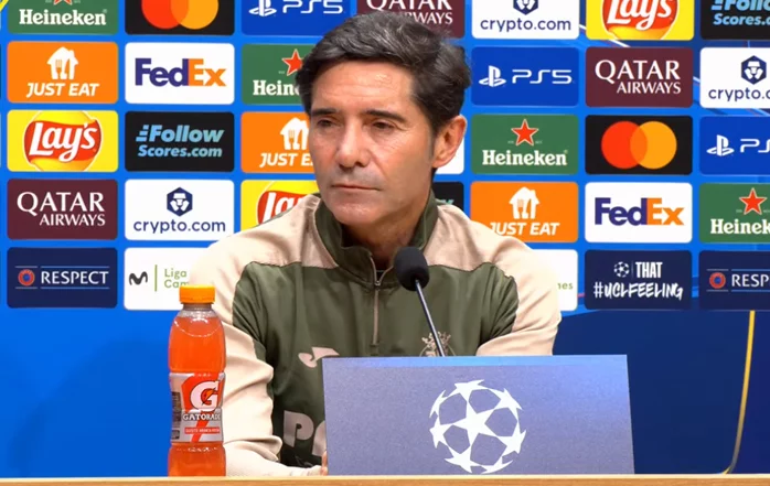 "Buenas tardes. Esperamos muchísima dificultad, como contra la Juve. Hace pocas semanas jugamos contra un campeón de Europa y hoy contra otro. Eso es lo que nos debe llenar de alegría: la entidad de los rivales a los cuales se enfrenta el Villarreal, producto de un muy buen trabajo la temporada pasada de todos los futbolistas que nos han traído aquí. Ahora toca disfrutarlo y sufrirlo. Mañana disfrutamos la competición y sufrimos al rival, que es muy bueno. Pero tenemos ilusión y creo que uno de los caminos importantes para progresar y crecer es tener este tipo de partidos. Es un aprendizaje máximo si queremos crecer, que queremos, y entonces vamos a jugar un partido con toda la ilusión ante nuestra afición, y esperamos estar a la altura y cosechar un buen resultado. Esa es la ilusión que tenemos."