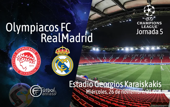 Este miércoles 26 de noviembre a las 21:00 h, el Estadio Georgios Karaiskakis, en El Pireo, será el escenario de un duelo clave en la quinta jornada de la Champions League: Olympiacos vs Real Madrid. El conjunto griego llega desde una posición baja en la clasificación general, tras dos empates y dos derrotas que complican su camino en la competición. Por su parte, el Real Madrid se encuentra en la novena posición de la tabla general, manteniéndose entre los equipos con más opciones de avanzar en el torneo, aunque obligado a vencer para no ver peligrar sus opciones de pasar entre los ocho primeros evitando los playoffs.