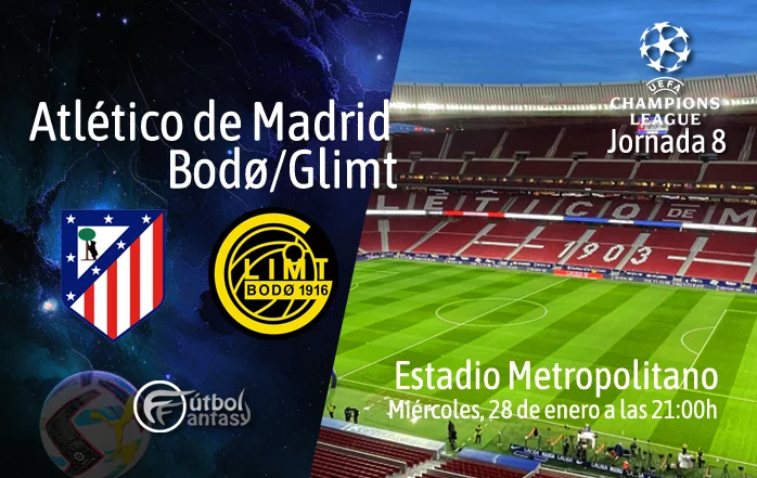 El Atlético de Madrid recibirá al Bodo/Glimt este miércoles 28 de enero a las 21:00 horas en el Estadio Metropolitano, en la octava jornada de la Champions League. El equipo rojiblanco, dirigido por Diego Pablo Simeone, llega a este partido con un buen rendimiento en la competición, acumulando 4 victorias, 1 empate y 2 derrotas, y buscará alcanzar las posiciones del top 8 para alcanzar los octavos evitando los playoffs. Por su parte, el Bodo/Glimt afronta el encuentro con un balance menos favorable, con 1 victoria, 3 empates y 3 derrotas, intentando aprovechar cualquier oportunidad para sumar puntos importantes fuera de casa y que una carambola les deje en la siguiente ronda.