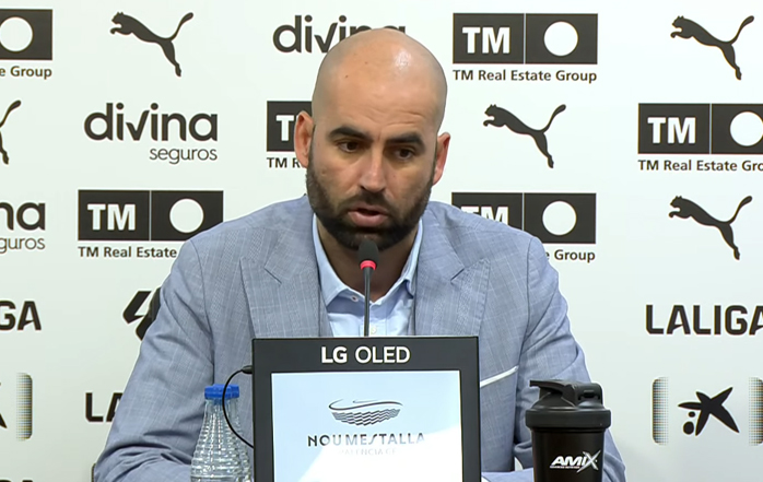 "Estoy mucho más pendiente de lo que hago yo que de lo que hacen los demás. Pienso que el Valencia tiene una buena plantilla, un buen entrenador y argumentos para poder ir hacia arriba, no tengo ninguna duda. En cuanto al planteamiento que mencionabas, preveíamos que podía suceder, que nos defendieran en 4-4-2 o 4-1-4-1, como ocurrió al final de la primera parte, o que hundieran a Rioja en algún momento para defender con cinco, más cerca de su portería, como también hicieron. Bueno, creo que el equipo tenía claro lo que debíamos hacer. Creo que en el press, cuando hemos estado compactos, hemos sido capaces de recuperar y robar el balón, pero no hemos logrado enganchar después de robar, y creo que ese ha sido uno de los problemas que hemos tenido hoy. Ha habido momentos en los que podíamos haber aprovechado transiciones claras para correr, pero no hemos estado acertados en el último tercio. Y cuando no estamos acertados, no es cuestión de nivel, porque el equipo lo tiene, sino de que en ciertos momentos el grado de confianza o de acierto no es el óptimo, y tenemos que seguir trabajando en ello. En cuanto a Valencia, no me cabe ninguna duda que es un equipo para más".