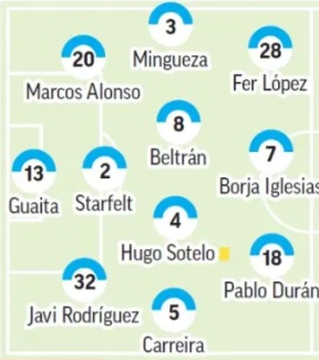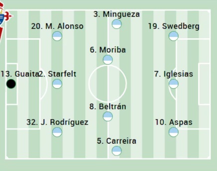 Guaita; Carreira, Javi Rodríguez, Starfelt, Alonso, Carreira; Moriba o Sotelo, Beltrán; Aspas o Fer López, Durán, Iglesias