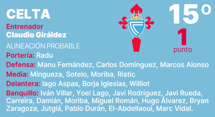 Claudio Giráldez deberá ajustar su once, y todo apunta a que habrá movimientos en prácticamente todas las líneas del equipo, lo que abre la puerta a que futbolistas que fueron suplentes en la última jornada tengan su oportunidad de inicio. Entre ellos figuran nombres como Mingueza, Javi Rodríguez, Ristic, Damián, Fran Beltrán, El Abdellaoui, Swedberg o Borja Iglesias, a los que se podría sumar también el joven Hugo Álvarez. La exigencia del calendario, con el primer compromiso intersemanal de la temporada, invita al técnico celeste a refrescar la alineación y dar entrada a jugadores con menos minutos.