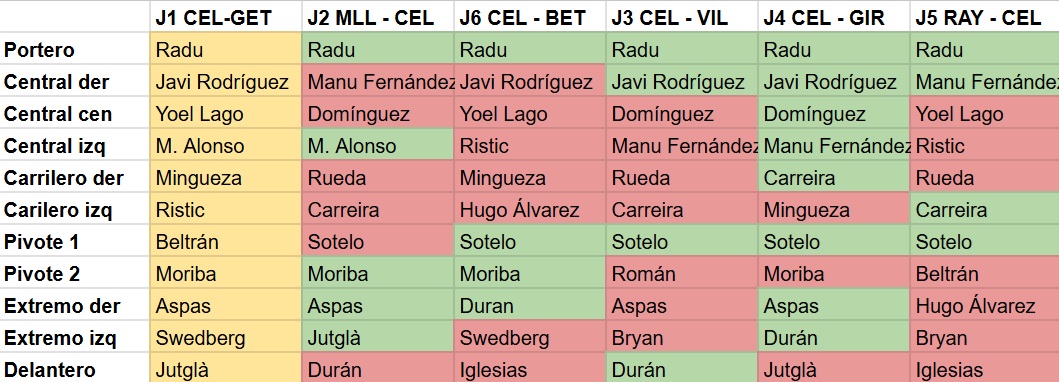 Futbolistas como Durán, Manu Fernández, Carreira, Javi Rodríguez, Moriba o Aspas han logrado cierta regularidad, alcanzando cuatro titularidades, pero ninguno ofrece garantías absolutas. Incluso en sus casos, el riesgo de alternancia es real. En cambio, otros nombres como Román, Swedberg, Bryan o Beltrán han tenido apariciones residuales, utilizadas como rotación táctica o recurso puntual. La consecuencia es un vestuario en el que prácticamente todos han sentido la titularidad y la suplencia en un corto espacio de tiempo.