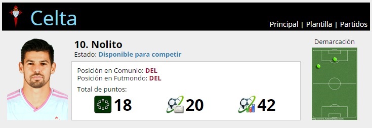 En el centro de este primer bloque se encuentra la información del jugador en los dos juegos que FutbolFantasy hace cobertura. Su nombre con dorsal, su disponibilidad para la segunda jornada de Liga (disponible, duda, lesionado, sancionado, indisponible...), las posiciones que ocupa en Comunio y Futmondo, y el total de puntos que lleva acumulados en ambos juegos: Comunio, Futmondo/Prensa y Futmondo/Estadísticas.