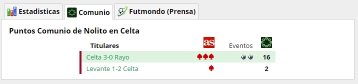 - La segunda pestaña reúne todo lo relacionado con Comunio, incluyendo las picas que ha recibido el jugador en cada partido.