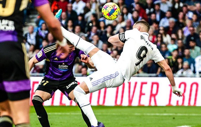 El Real Madrid ha vencido por 6-0 al Real Valladolid este domingo por la tarde en el Santiago Bernabéu, en el encuentro correspondiente a la jornada 27 de Liga, con tres goles de Karim Benzema. El delantero francés, además, fue el autor de un gol de bella factura mediante un remate acrobático, estando de espaldas a portería y que muchos han catalogado en las redes sociales de "gol de chilena".