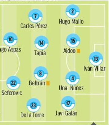 Iván Villar; Mallo, Aidoo, Núñez, Galán; Tapia, Beltrán; De la Torre, Carles Pérez; Aspas, Seferovic