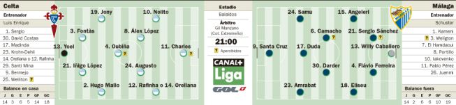 Luis Enrique recupera a Rafinha para este trascendental choque. Cuando el ataque celeste está bloqueado, recurre a la inspiración de su estrella para buscar una solución. En ese sentido, la magia del hispano-brasileño puede ser decisiva para desactivar la dañada defensa malaguista. Schuster cuenta con las importantes ausencias de Gámez y Antunes, por lo que tendrá que inventar a Angeleri y Eliseu como laterales. Además, el vestuario andaluz ha sufrido esta semana un importante mazazo, la grave lesión de Tissone. El conjunto blanquiazul quiere dedicarle una victoria al mediocentro en estos momentos tan duros que le toca vivir. Los tres puntos darían aire a un Málaga que lleva mucho tiempo jugando con fuego. Esta noche pueden dormir a seis puntos del descenso o a tiro de piedra del Valladolid.