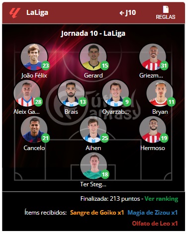 ¡El décimo ganador de la temporada es Melo! El usuario del Fantasy RPG ha conseguido la friolera de 213 puntos con una formación compuesta por Ter Stegen; Hermoso, Aihen, Cancelo; Bryan, Oyarzabal, Brais, Aleix García; Griezmann, Gerard y Joao Félix. Además, se observa como no ha utilizado ningún ítem, lo que todavía tiene más mérito su espectacular puntuación.