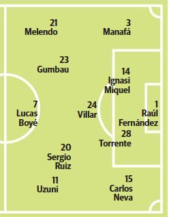 Ferreira; Manafá, Ignasi Miquel, Torrente, Neva; Melendo, Villar, Gumbau, Álvaro; Boyé, Uzuni.