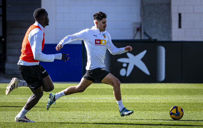 El Valencia CF ha completado la primera sesión de entrenamiento este lunes por la mañana en las instalaciones de la Ciutat Esportiva de Paterna, con el objetivo de comenzar a preparar el encuentro del próximo domingo contra el FC Barcelona, a las 21:00 horas, correspondiente a la jornada 21 del campeonato de Liga, que se disputará en el Estadi Olímpic Lluís Companys.