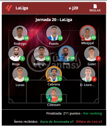 ¡El ganador de la jornada 20 es ElGranChicho! El usuario del Fantasy RPG ha conseguido la friolera de 211 puntos con una formación compuesta por Cillessen; Llorente, Cabrera, Lucas; Güler, Isco, Bellingham, Rioja; Mbappé, Puado y Rodrygo. Se ha observado cómo ha utilizado ítems en Cillessen, Cabrera, Isco y Mbappé, lo que ha provocado esta espectacular puntuación.