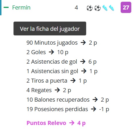 Para consultar este desglose de puntos estadísticos, basta con ampliar la fila del jugador en cuestión, en el apartado puntos del partido correspondiente.