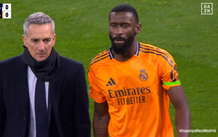 El defensa central alemán del Real Madrid, Antonio Rüdiger, se ha visto obligado a abandonar el césped del RCDE Stadium en el minuto 15 del partido, al notar unas molestias musculares. El futbolista, que hoy acompañaba a Tchouaméni en el eje de la defensa blanca, no pudo continuar y, tras ser atendido por los Servicios Médicos del club, dejó el campo para que entre Raúl Asencio.
