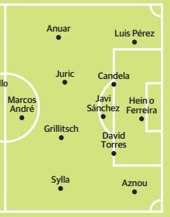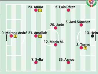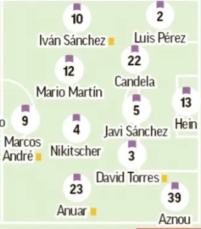 Hein en la puerta; Luis Pérez, Javi Sánchez, Torres y Aznou en defensa; Martín, Juric y Nikitscher en la medular; con Anuar y Amallah en los extremos, junto a Marcos André en punta.