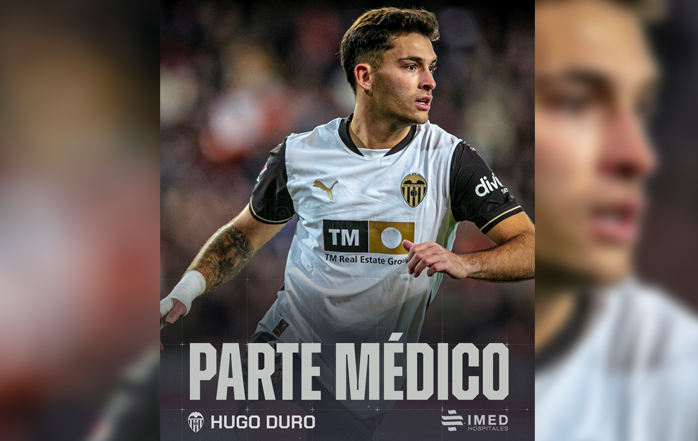 El Valencia CF ha comunicado en la tarde de este martes que "el jugador del Hugo Duro, sufre una lesión fibrilar del músculo gemelo externo de su pierna izquierda consecuencia de un traumatismo, por lo que será baja hasta mejoría clínica", algo que ya se sabía desde ayer. Además, explica que "el delantero valencianista seguirá tratamiento de fisioterapia y readaptación hasta su reincorporación progresiva con el resto del grupo", sin especificar el tiempo de baja, por lo que esta información oficial todavía da menos información que la que publicamos ayer, cuando se supo que iba a estar cuatro semanas de baja.