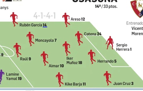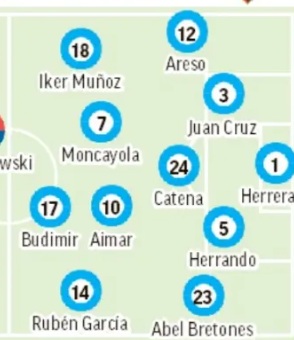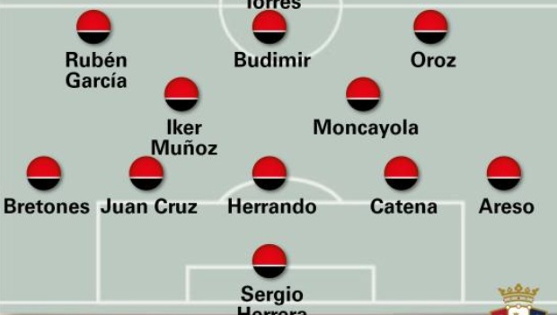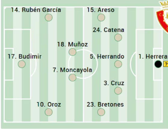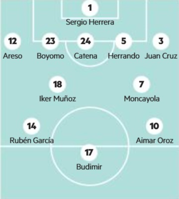 Alineación: Todo apunta a que Vicente Moreno planteará un once con defensa de cinco, con Juan Cruz como central zurdo y Abel Bretones como carrilero, salvo que opte por arriesgar con Boyomo como central. El doble pivote lo formarán Iker Muñoz y Jon Moncayola por la baja de Lucas Torró, aunque no se descarta a Pablo Ibáñez. Arriba, Moreno decidirá sobre Ante Budimir, desgastado tras jugar con Croacia y con otro partido ante Athletic Club el fin de semana; si no sale de inicio, Raúl García de Haro podría ser titular.