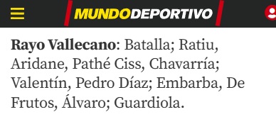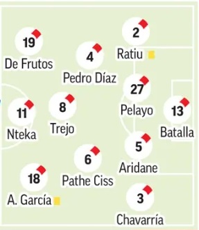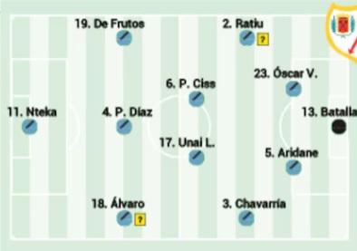 Alineación: Ante las bajas en defensa, todo apunta a que la pareja de centrales será la formada por Aridane Hernández y Pelayo Fernández. No obstante, existe la posibilidad también de retrasar a Pathe Ciss y que sea Óscar Valentín el pivote defensivo. Si Pedro Díaz no llega a tiempo por sus molestias, podría dejar su sitio a Unai López o Gerard Gumbau en la medular. En la mediapunta, un Isi Palazón ya recuperado podría aparecer de forma sorprendente en la alineación titular dejando fuera a Trejo, mientras que la delantera será para Guardiola o Nteka, sin descartar a Álvaro, con Embarba en la banda. El Rayo buscará un once competitivo para sumar tres puntos fuera de casa.