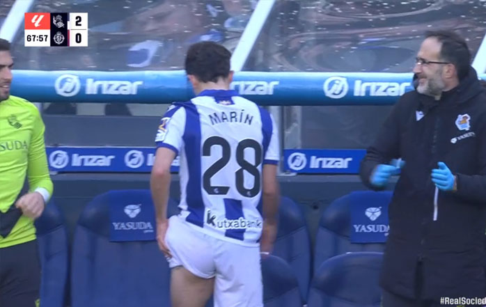 El volante ofensivo de la Real Sociedad, Pablo Marín, se vio obligado a abandonar el terreno de juego en el minuto 67 del partido disputado este sábado por la tarde en el Reale Arena contra el Real Valladolid. El jugador sufrió molestias en el muslo izquierdo, probablemente a causa de un golpe en la parte externa de la pierna. Tras su retirada, fue sustituido por Luka Sučić. Su evolución será evaluada en los próximos días para determinar el alcance de la lesión.