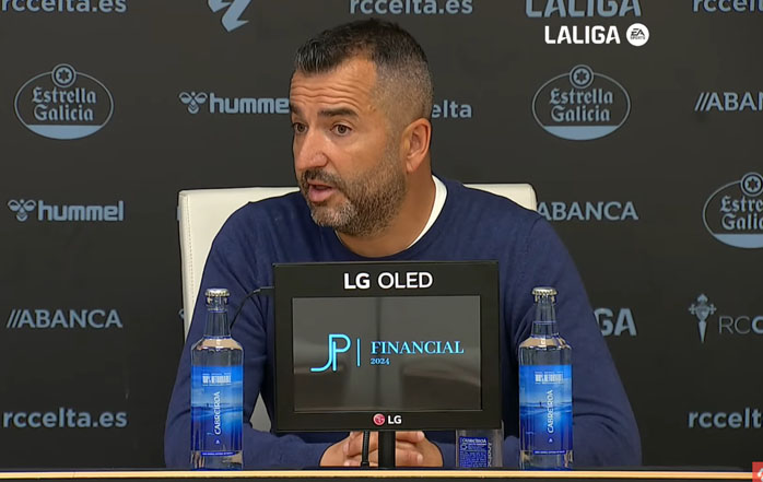 "Bueno, yo creo que la lectura del partido es otra. Bajo mi punto de vista, evidentemente, estuvimos mucho mejor en la segunda parte, que es lo que queríamos. Ellos son un gran rival. Es verdad que nos costó ajustar en ciertas situaciones, pero el partido, evidentemente, el que queremos es el de la segunda parte. El Celta, si has visto algún partido del Celta contra otros equipos, te somete mucho. Tiene mucha gente por dentro. Teníamos que controlarle bien esas paredes por dentro. Incluso el plan de partido viene condicionado por esas… perdón, las alineaciones, los cambios vienen condicionados por el tipo de plan de partido que tocaba. Evidentemente, estamos ante un equipo que está en una dinámica muy positiva. Insisto, un equipo muy complicado. Y yo creo que, evidentemente, la segunda parte es lo que queríamos todos. Pero también es cierto que esa primera parte, el no haber encajado gol, es muy importante. Sobre todo después de, una vez más, acontecimientos en contra: tenemos que cambiar al portero, te condicionan las ventanas, te condicionan muchas cosas. Me quedo, evidentemente, con que el equipo ha competido muy bien. Insisto, nos gusta mucho más a todos porque también el tipo de partido era este. Y que el equipo ha hecho un gol más que el rival, y se lo han anulado porque han interpretado una jugada que, francamente, es un poco difícil de interpretar, porque yo la he visto repetida y, en mi opinión, creo que no interfiere en la acción; se va incluso para fuera".