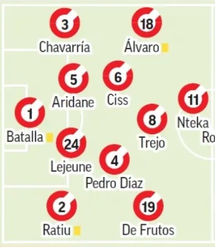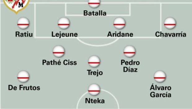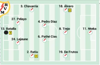 Alineación: Se espera el regreso de Florian Lejeune a la defensa tras cumplir su sanción, lo que fortalecerá la línea trasera del Rayo. También se prevé la titularidad de Pedro Díaz, quien no fue de la partida en el último encuentro debido a un problema físico, pero su gol desde el banquillo ante el Alavés le hace candidato a volver al once. Esto generará dudas en la mediapunta, donde Óscar Trejo, Unai López y un ya recuperado Isi Palazón compiten por un puesto. Álvaro García se espera que llegue a tiempo para ser titular, pero Adrián Embarba está listo para enfrentarse a su ex equipo.