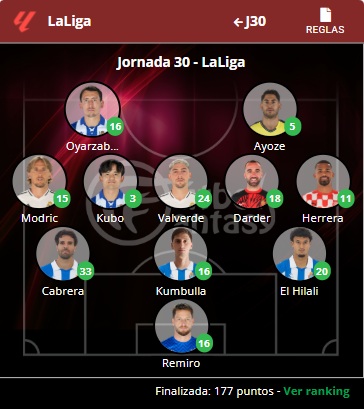 Fantasy RPG: ¡cristianp66 gana la jornada 30 de LaLiga y dalbillos se mantiene líder!