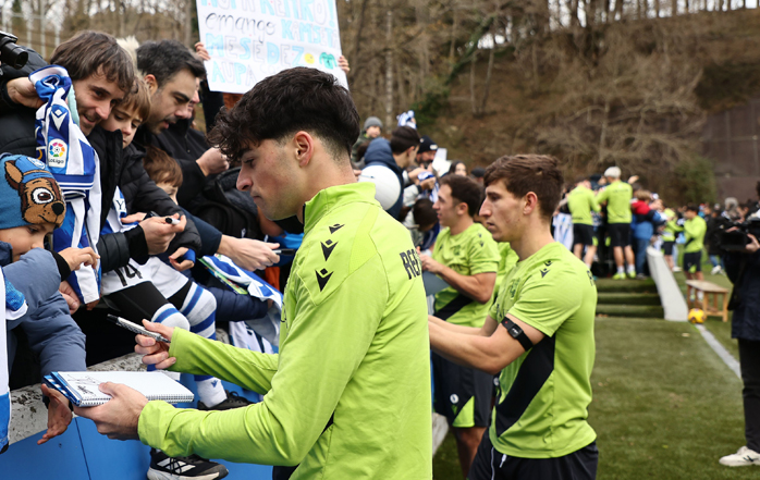 El técnico del conjunto txuri urdin, Imanol Alguacil, ha dirigido una sesión marcada por varias ausencias destacadas. El gran ausente ha sido Barrenetxea, que no ha salido al césped tras el esguince de tobillo que sufrió en el último partido. Tampoco han participado Zubeldia, Aguerd, Zakharyan, Odriozola y Becker, todos trabajando al margen dentro de las instalaciones. El lateral donostiarra se ha dejado ver brevemente en el campo, aunque aún no está listo para volver con el grupo. Take Kubo se ha retirado a los 40 minutos, aparentemente sin molestias, deteniéndose a firmar autógrafos a varios jóvenes.