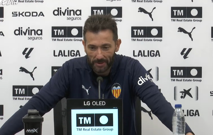 "Sí, el campo es de dimensiones distintas, es más estrecho y más corto que otros estadios, y eso condiciona lo que pasa en el juego. Pero eso, encima, está acrecentado por el estilo del rival, que es un equipo que trata de optimizar esas dimensiones para incomodarte al máximo en el partido. A nivel de intensidad, es el equipo con más sprints de la Liga. En alta intensidad, creo que solo está superado por el Barcelona en el número de sprints; la distancia explosiva en el fútbol, la distancia de máxima velocidad, es el equipo que más la tiene. Y eso ya te pone en perspectiva respecto al partido que vamos a vivenciar: un partido de mucho ritmo, un partido frenético, que ellos van a intentar llevar a ese ritmo que tienen, y nosotros tenemos que tener la respuesta necesaria para ser competitivos en ese partido. En cuanto a Sergi, fue un gol importante porque fue la última victoria en ese campo del Valencia, y fue un gol muy bonito que yo he visto".