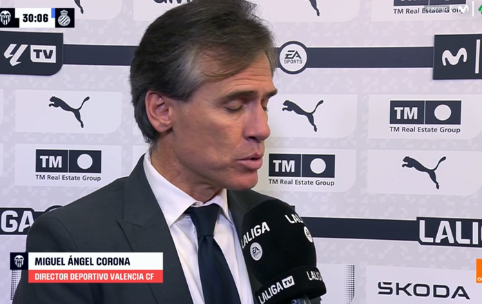 El director deportivo del Valencia, Miguel Ángel Corona, atendió a los micrófonos de Movistar antes del partido de este martes por la tarde contra el RCD Espanyol, correspondiente a la jornada 33 del campeonato de Liga.
