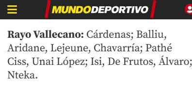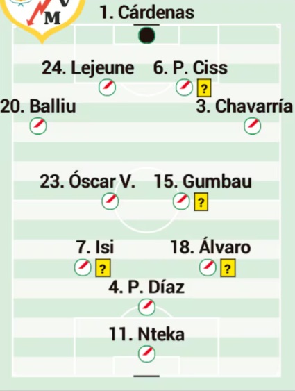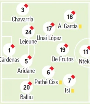 Alineación: Se esperan cambios en el once inicial respecto al partido frente al Atlético en el Riyadh Air Metropolitano. Dani Cárdenas ocupará la portería, mientras que jugadores como Óscar Valentín, Unai López y Alfonso Espino, que fueron sustituidos temprano, podrían dejar su lugar a Gumbau, Jorge de Frutos y Pep Chavarría, desplazando a Isi Palazón a la mediapunta. Todo indica que Pathé Ciss continuará como central tras los flojos desempeños de Aridane Hernández.