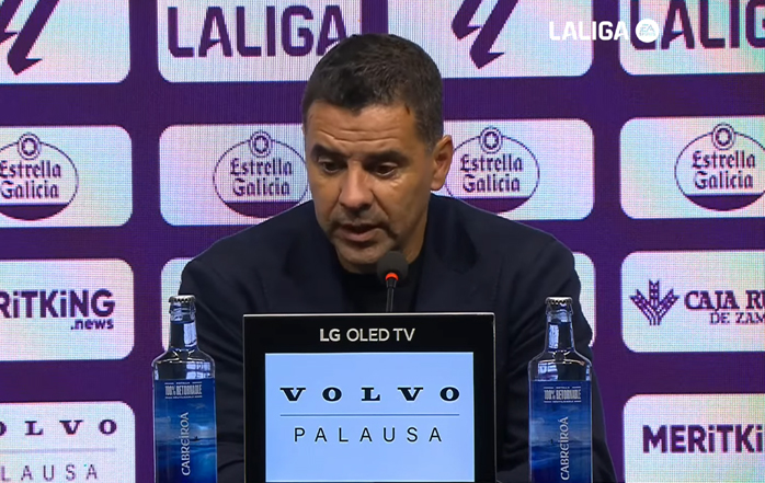 "He dicho a Álvaro que enhorabuena por el trabajo que está haciendo. Sé que es difícil para él, un tío de la casa que está sufriendo, como sufrimos todos los jugadores, pero él tiene ese sentimiento también de ser del Valladolid. No, no, no. El Valladolid ha competido y ha puesto honor a la competición, pero es que lo viene haciendo. Yo se lo he dicho a los jugadores, digo, el Valladolid está y va a competir bien. Tenemos que igualar en competitividad y tener esa necesidad que nosotros tenemos y ellos no. Y la necesidad, cuando hemos metido el 0-1, se ha notado. Pero se ha notado para mal, porque el Valladolid se ha liberado todavía más y nosotros nos hemos agarrotado un poco y hemos dado un pasito para atrás. Pero yo sabía que iba a ser un partido muy complicado. Álvaro ha planteado el partido para ganar, me parece lo correcto y lo normal y lo que tiene que hacer. El que meta una línea de cinco lo ha hecho también para salir por fuera, lo ha hecho para que Moro tenga más posibilidades de uno contra uno. Si nosotros saltábamos a los carrileros, bueno, yo creo que ha hecho cosas para ganar el partido y es lo que tiene que hacer un entrenador. Entonces, me parece muy bien."