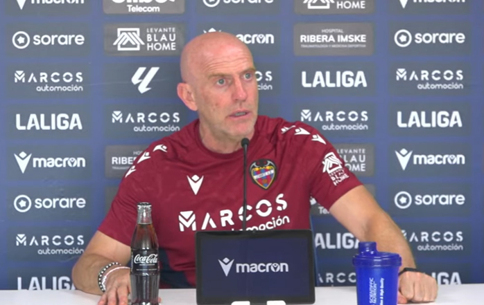 "A mí me gusta competir con los mejores. Siempre me ha gustado competir con los mejores y medirme con los mejores. ¿Qué sucede? Que los mejores son muy buenos, y tienes que exprimirte al máximo. Y, aun exprimiéndote al máximo, a veces estás en inferioridad, porque son los mejores. Ir a los mejores estadios de España, jugar contra los mejores equipos de España, enfrentarte a los mejores entrenadores de España, pues es un reto. Es un reto. Personalmente, a mí, como me encantan los retos, pues quiero medirme. Y quiero que mi equipo se mida. A ver si damos la talla en cuanto a competir bien. Y ese competir bien nos hace que el año que viene podamos estar todos contentos. Pero dicho eso, lo que me toca es este domingo competir con el Eibar y estar extraordinariamente bien. Y disfrutar con nuestra gente de lo ya conseguido. Y, a partir de ahí, ver si le sumamos ese bonito broche de oro a la temporada, que sería ser campeón. Que no es baladí. Que es una cosa muy importante. Por eso quiero centrar ahí mucho el tiro. Lo demás pasará el año que viene. Es emocionante. Es un reto increíble e iremos a por él. No nos va a dar miedo de nada. Tendremos respeto, pero miedo a ninguno. El Levante Unión Deportiva no va a tener miedo a nadie, pero respeto a todos sí, porque somos nuevos. Somos los nuevos. Entonces, hay que tener respeto."