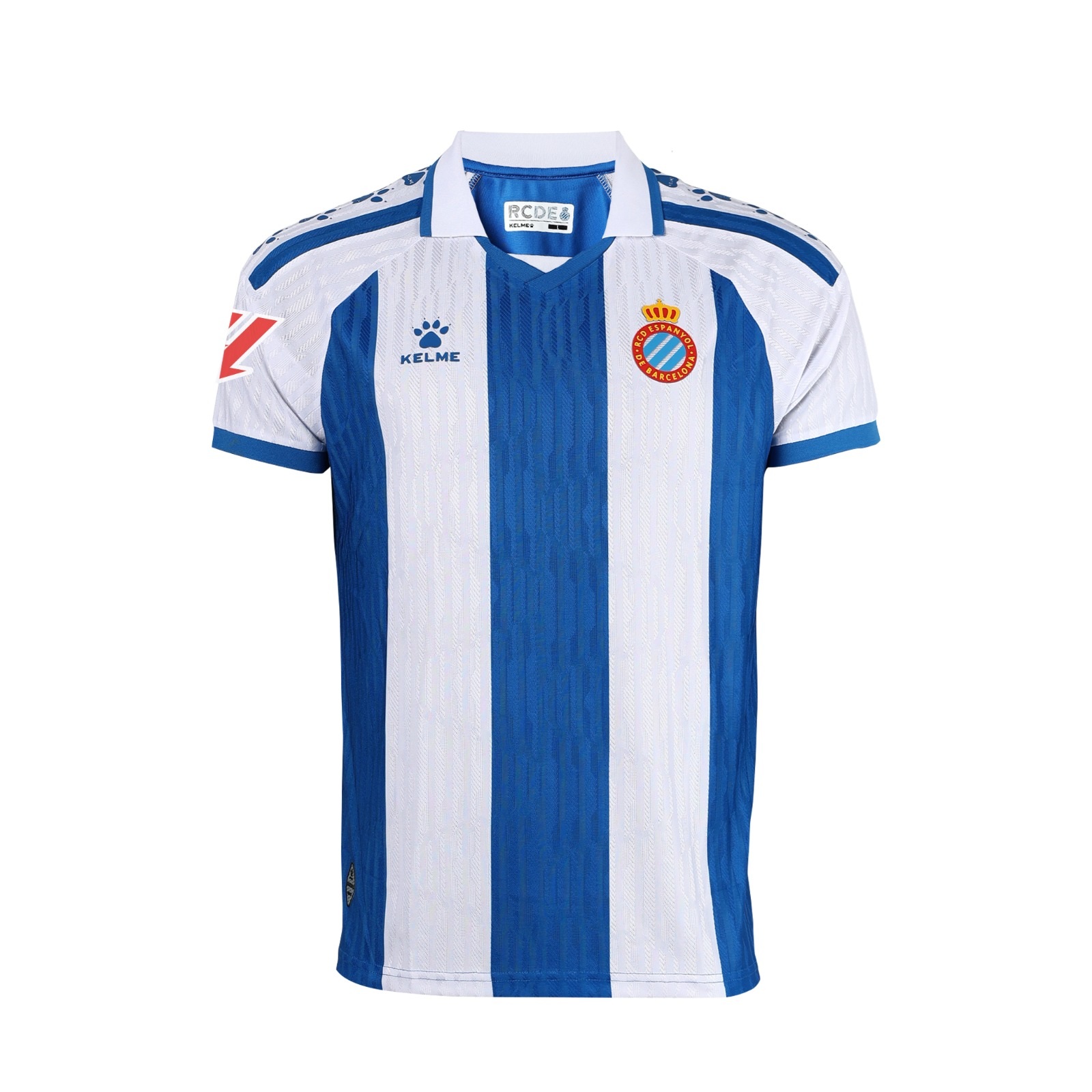 El diseño, creado junto a Kelme, recupera el espíritu ochentero con un toque moderno y elegante. Destacan la franja central blanquiazul, el cuello tipo polo y las mangas ribeteadas con la garra del patrocinador técnico. Un símbolo de identidad que conecta pasado y presente.