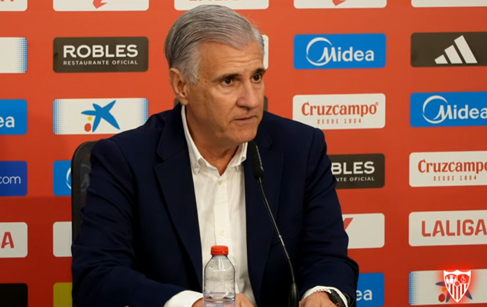 "Bueno, primero agradecer. Nos ha faltado un poco agradecer tanto a sus agentes, a Seba como a Fernando, por haber apostado por el Sevilla y también a su familia. Y bueno, agradecer también a todos los compañeros del club por este fichaje porque creo que han estado todos muy atentos y se ha hecho un trabajo muy importante dentro del club, de todos los estamentos del club, muy rápido y muy veloz y creo que ese es el camino que vamos a llevar o vamos a tratar de llevar en los próximos años. Y bueno, agradecer a todas las personas que han estado involucradas por su efectividad. Y bueno, es el perfil que Sevilla busca de los jugadores: un perfil de un jugador comprometido, un jugador valiente, un jugador competitivo, un jugador humilde, un jugador honesto, un jugador con hambre, un jugador feliz y un jugador que viene a aportar liderazgo y competitividad y es sumar al grupo y esas son las características principales. Luego podemos hablar de sus diferentes posiciones, que él las ha explicado muy bien. Puede jugar, indudablemente nosotros nos fijamos en él, sobre todo para la posición de lateral izquierdo, aunque él ha desarrollado mucha parte de su carrera de centrocampista y bueno, es un jugador que creo que nos va a aportar mucho al grupo en todas las facetas, tanto dentro como fuera del campo."