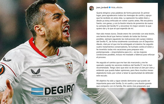 El centrocampista del Sevilla FC, Joan Jordán, estará aproximadamente tres meses de baja tras someterse a una operación para corregir una hernia discal que arrastraba desde su etapa en el Deportivo Alavés. El jugador catalán ha querido compartir un mensaje personal a través de sus redes sociales para agradecer el apoyo recibido y aclarar que la intervención ha seguido los tiempos e indicaciones del cuerpo médico del Sevilla FC, en coordinación con el Alavés. Jordán, que se perderá la pretemporada y el inicio del curso, mantiene intacta su ilusión por triunfar con la camiseta sevillista.