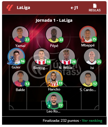 El once ganador estuvo formado por Leo Román (27 puntos) en la portería, reforzado con un ítem que multiplicó su rendimiento. En defensa, Balde (13), Hancko (11) —también potenciado— y S. Cardona (17) aportaron solidez y equilibrio. En el centro del campo, brillaron Arda Güler (16) con ítem activado, Berenguer (10), Nico Williams (28) e Isi Palazón (25), sumando goles y protagonismo.