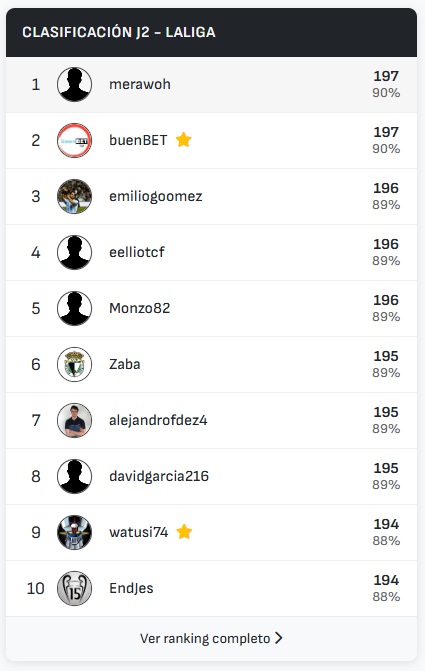 Predicted11 continúa consolidándose como el gran punto de encuentro mundial de expertos en alineaciones probables y, tras el exitoso estreno de la primera jornada, la segunda fecha de Liga ha vuelto a dejar cifras espectaculares tanto en participación como en nivel de acierto. En esta ocasión, los grandes protagonistas han sido los usuarios Merawoh y buenBet, que han compartido la primera posición con un total de 197 aciertos sobre 220 posibles, confirmando la exigencia y la emoción que caracteriza al proyecto.