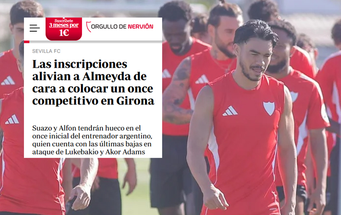 El Sevilla FC encara su visita a Montilivi con un respiro inesperado para Matías Almeyda. LaLiga ha validado las inscripciones de algunos de los fichajes que estaban bloqueados por el límite salarial, lo que permite al técnico argentino contar con Alfon y Suazo para la tercera jornada liguera frente al Girona. Según asegura ABC de Sevilla este viernes, ambos futbolistas serán titulares en un once que todavía acusa las bajas en ataque de Lukebakio y Akor Adams, además de la incertidumbre sobre la situación de Vargas, que se ejercita con normalidad mientras espera el cierre de su traspaso al Villarreal.