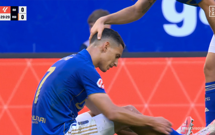 El extremo del Real Oviedo, Ilyas Chaira, se ha visto obligado a pedir el cambio en el minuto 30 del partido de este sábado contra la Real Sociedad, correspondiente a la jornada 3 del campeonato de Liga, que se disputó en el Estadio Carlos Tartiere, debido a una lesión de tobillo. El futbolista tuvo que ser atendido antes de pedir la sustitución, dejando su sitio a Haissem Hassan.